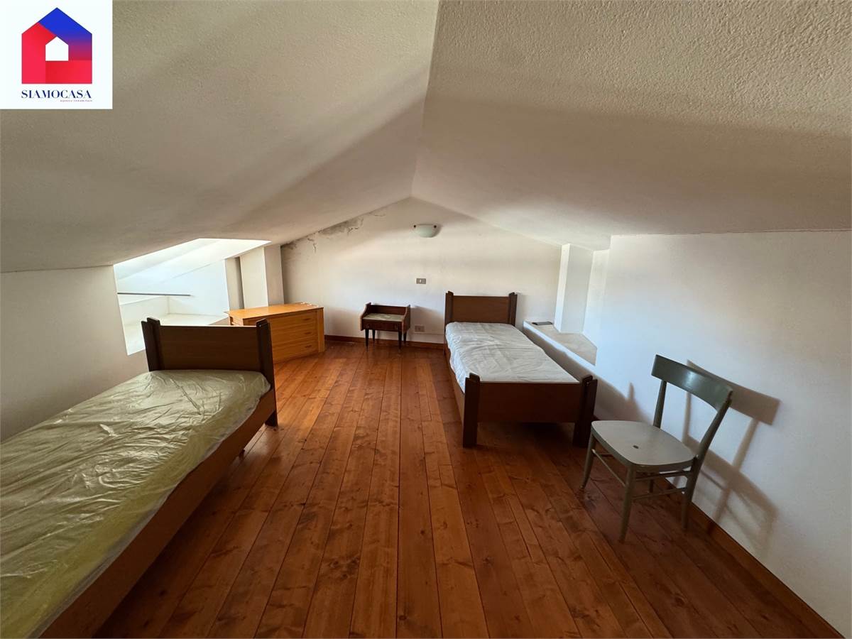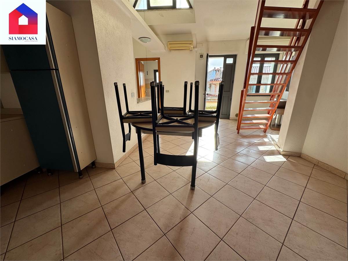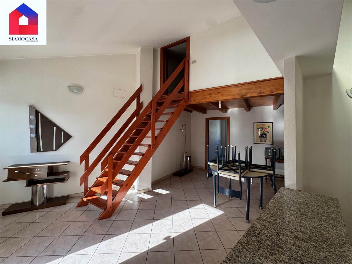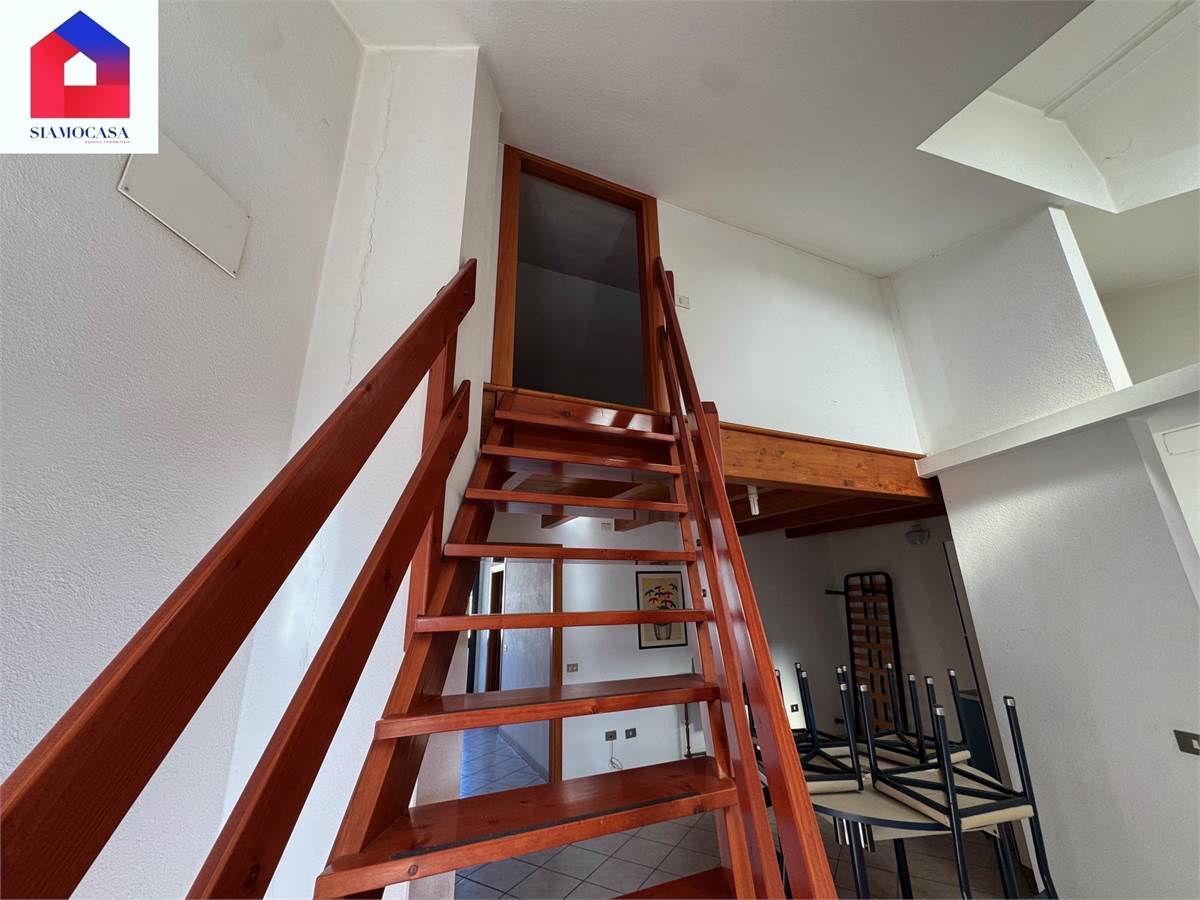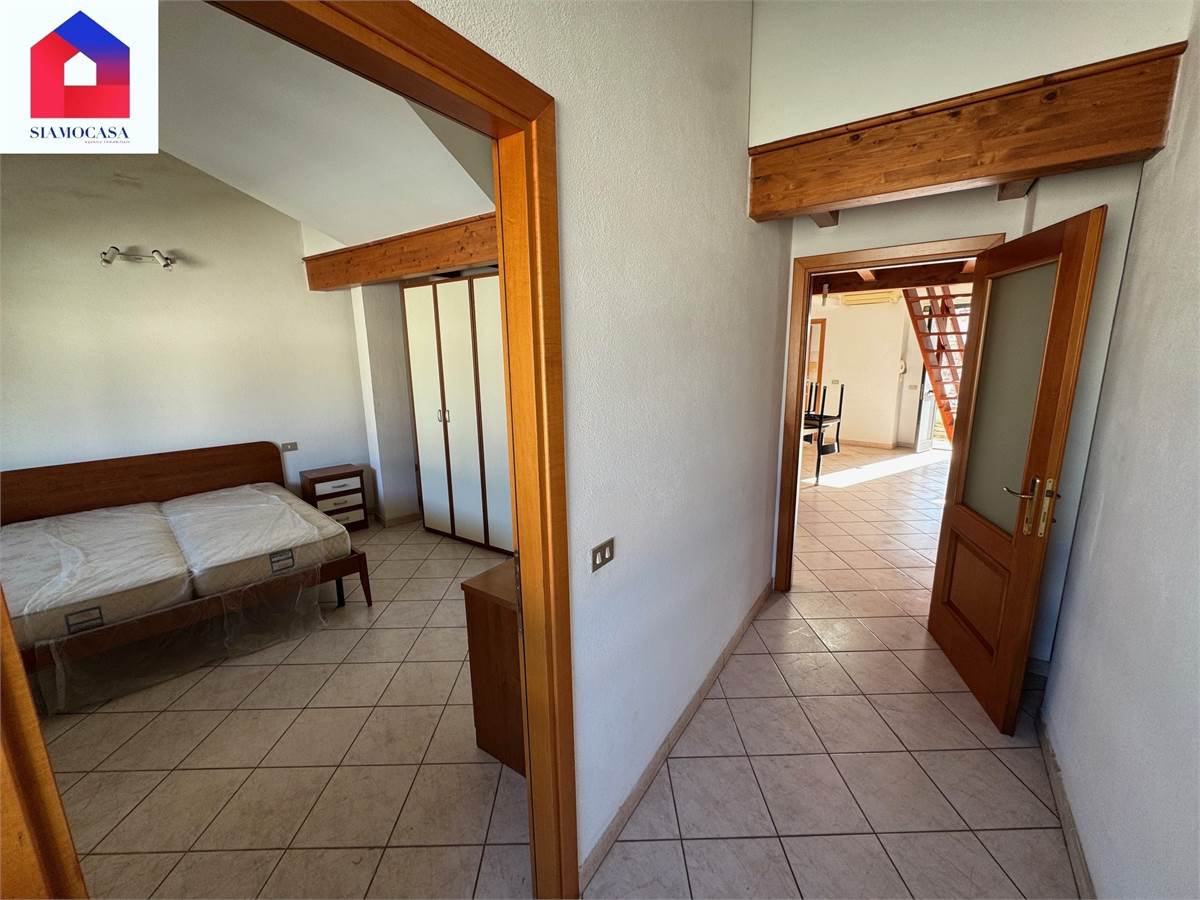 al primo piano, con ingresso da viale di Vittorio, c’è l’alloggio che ha la sua entrata indipendente, il soggiorno con l’angolo cottura a vista, una camera da letto matrimoniale, il bagno con la doccia e due balconi; piano superiore, soppalcato, dove ci si arriva con una scala in legno e in cui troviamo una seconda camera.