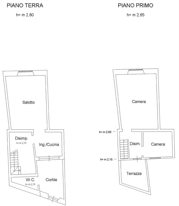 piano terra con ingresso, piccolo cortile, bagno, disimpegno, cucinotto, piccola sala da pranzo (con camino), lavanderia e soggiorno;