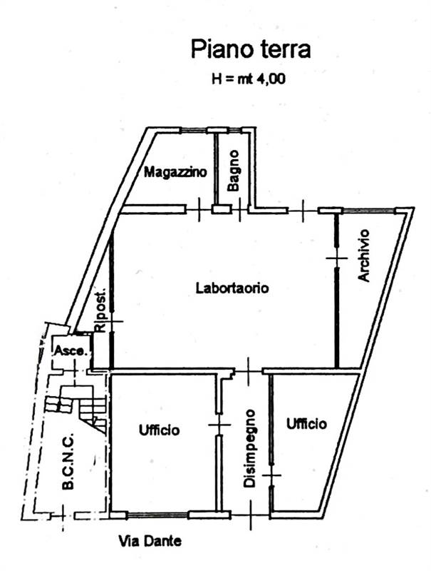 ingresso, disimpegno, due uffici, ripostiglio, magazzino, laboratorio, archivio e bagno.